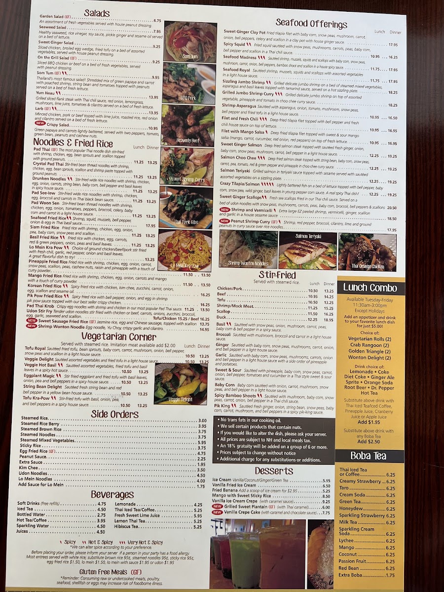 Fried squids sauteed with snow peas, mushrooms, carrots, peas, onion, and scallion in a Thai chili sauce.